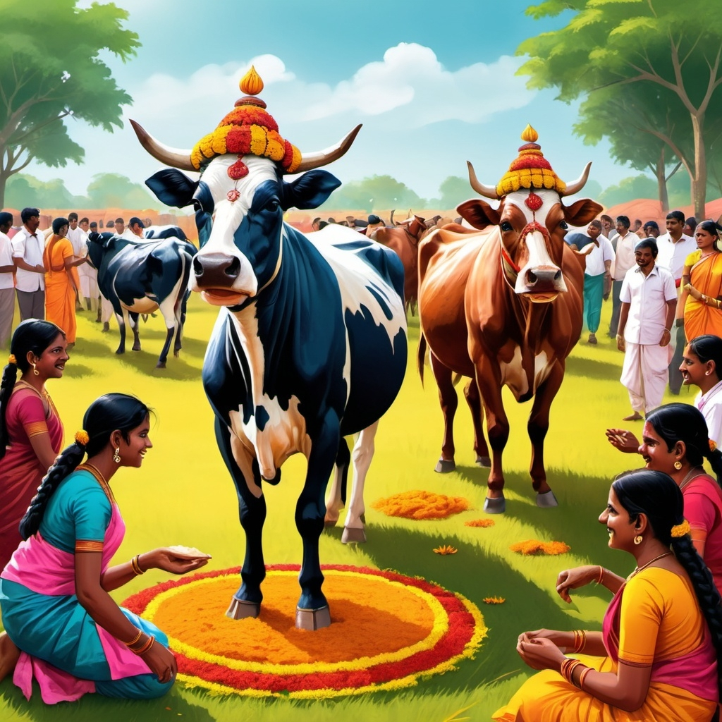Tale: In the southern state of Tamil Nadu, the four-day Pongal festival is a time of joy, gratitude, and worship, with the third day, Mattu Pongal, dedicated entirely to cows. As dawn breaks, farmers lovingly wash their cows, paint their horns, and adorn them with vibrant garlands. These cows are more than livestock; they are considered family, and their role in ensuring a bountiful harvest is celebrated with reverence.